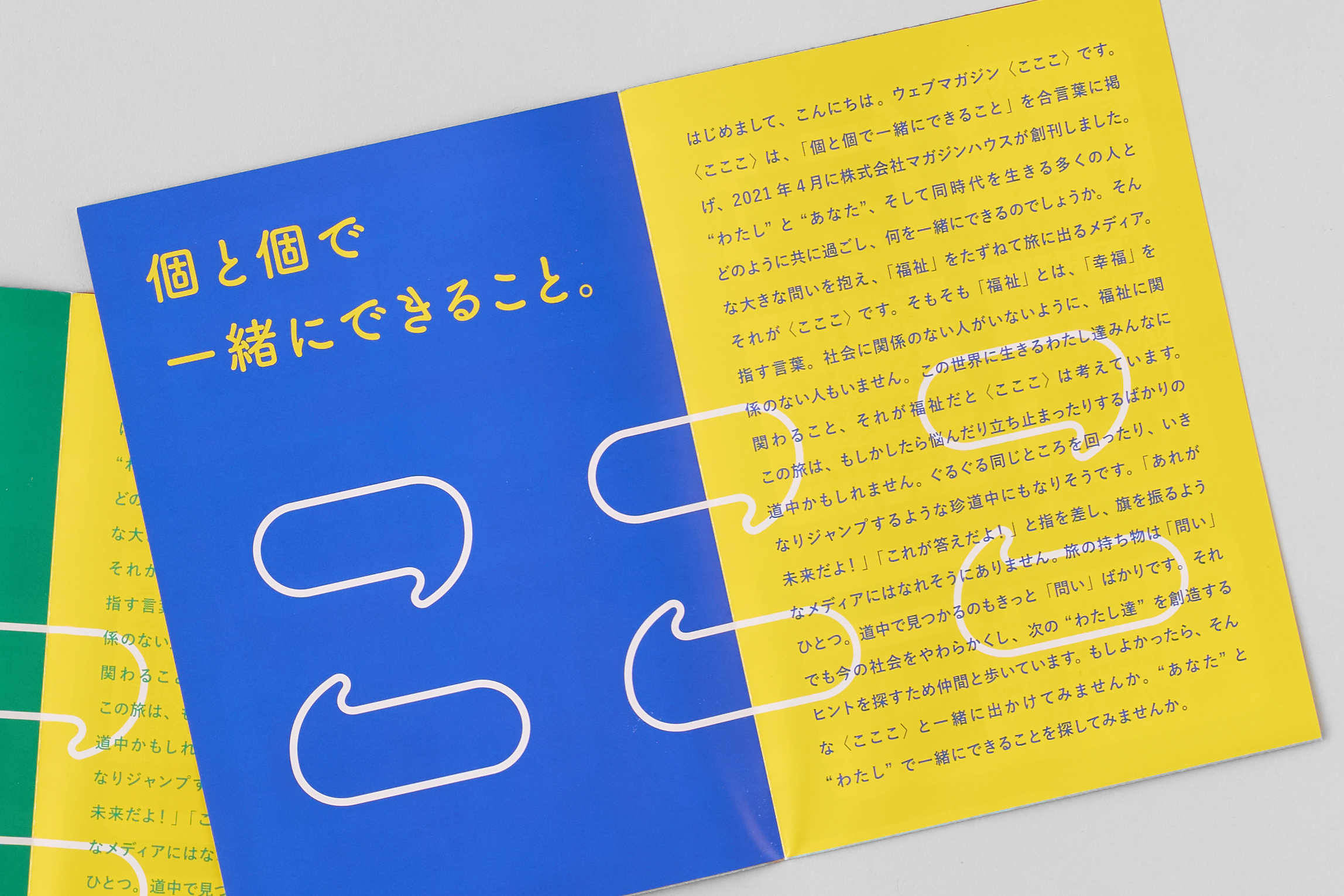 株式会社マガジンハウスが2021年に創刊したウェブメディア「福祉をたずねるクリエイティブマガジン〈こここ〉」の紹介リーフレットの企画制作を手掛けました。